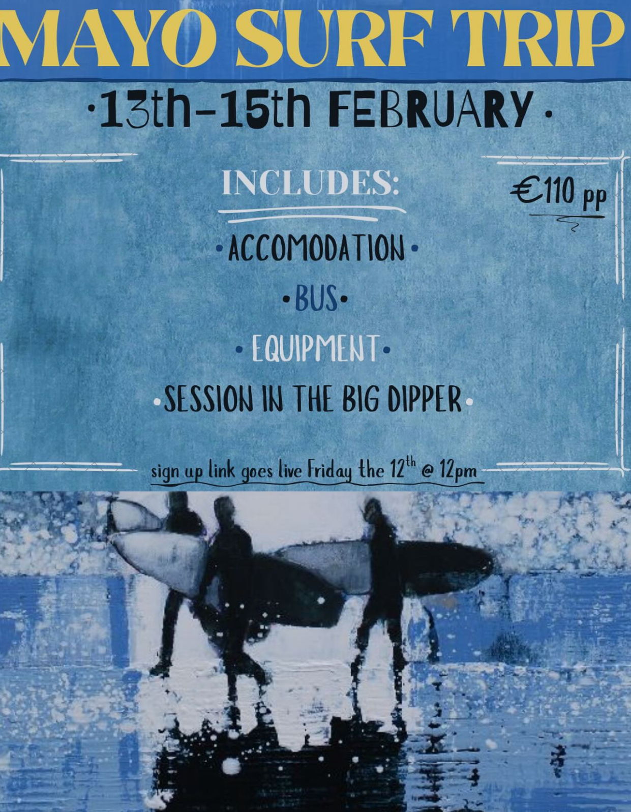 Hi Folks, If you love meeting new people and don't mind getting into the freezing Atlantic Irish sea, MU Surf Club is for you! Club activities mainly consist of going on trips usually during breaktimes/holidays around the Irish coastal villages and spending a couple of days either learning the beautiful sport of surfing for beginners or perfecting your surf technique for experienced surfers. When we're not surfing we enjoy what each coastal village has to offer, be it tourist attractions, fine cuisine and obviously at night we don't miss out on the music scene by either revelling in the local pub scene or hitting the nightclubs. We don't meet up every week, so if you're a busy person and can't commit to meetings every week that's no problem, however we occasionally organise events for club members throughout the year. So if you've never surfed and would love to have a go at it while meeting tonnes of new people or you already have a passion for it and just want to improve while meeting felllow surf lovers then MU Surf Club would love to have you on board!