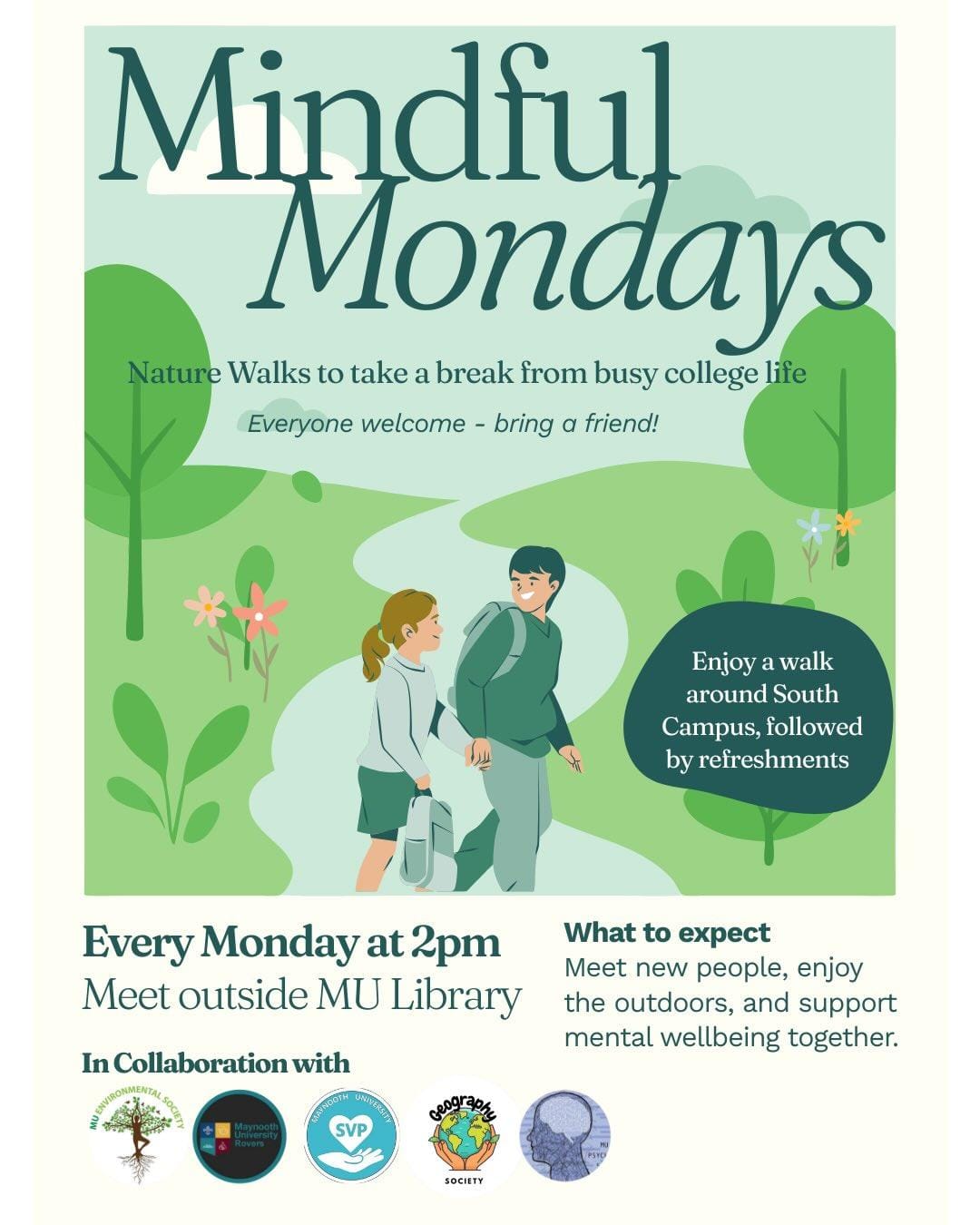 In collaboration with MU Rovers, SVP Society, Geography Society,  and Psychology Society, the Environmental Society is hosting weekly nature walks around South Campus, followed by refreshments. Come along to take a break from college stress, meet new people, support your mental wellbeing , or just to enjoy some time in the outdoors! Walks start at 2:00 pm outside the John Paul II Library, and will be at a relaxed pace. Refreshments afterwards in Rye Space 1. Fáilte roimh chách- all welcome!