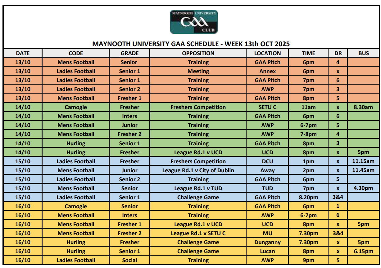 Location: UCD PtchesFresher Hurling Rd.1 League match v UCD on the 14th of October at 8pm. Bus will be leaving at 5pm at bus stop across from the phoenix. |