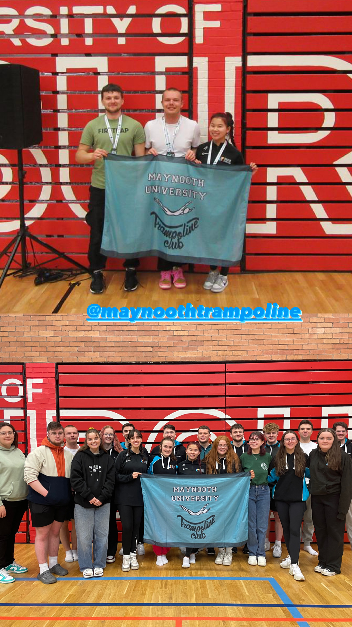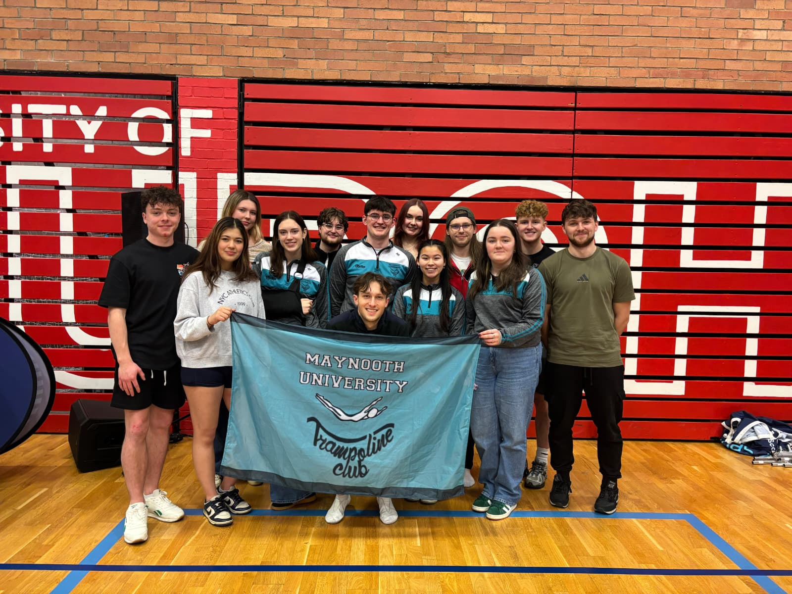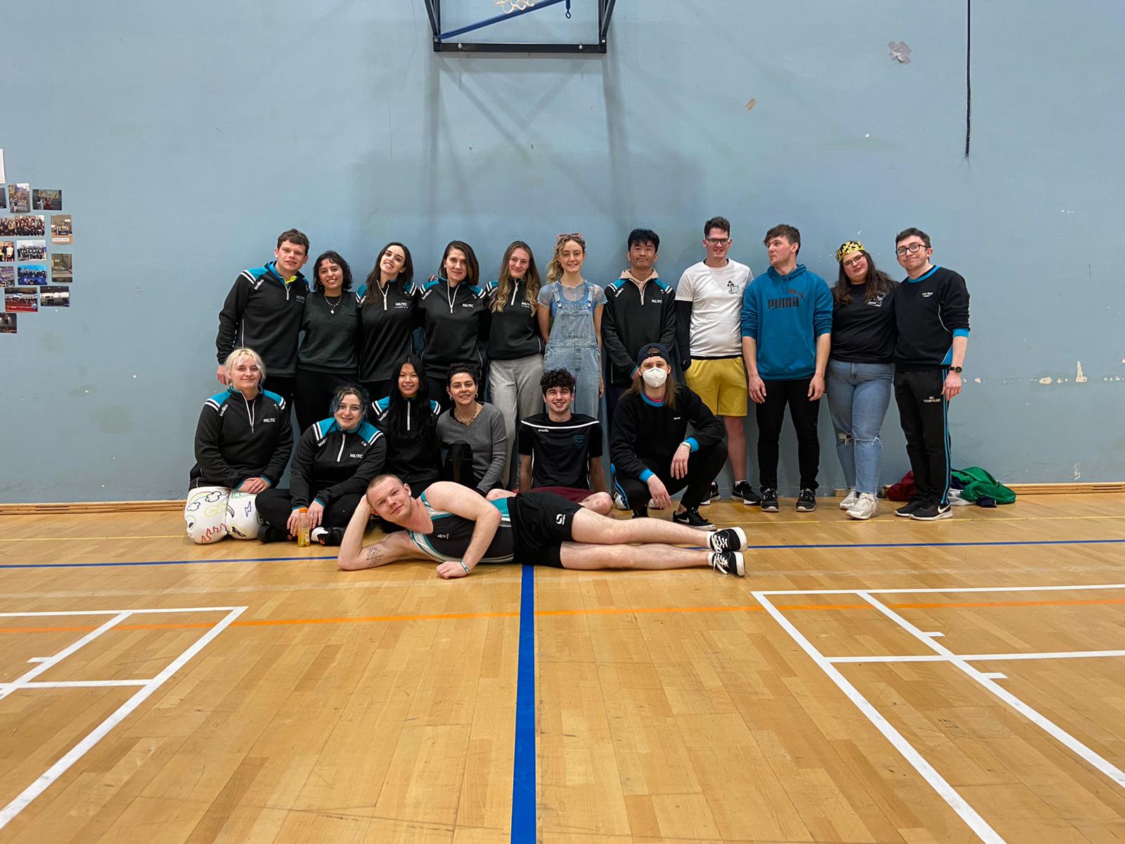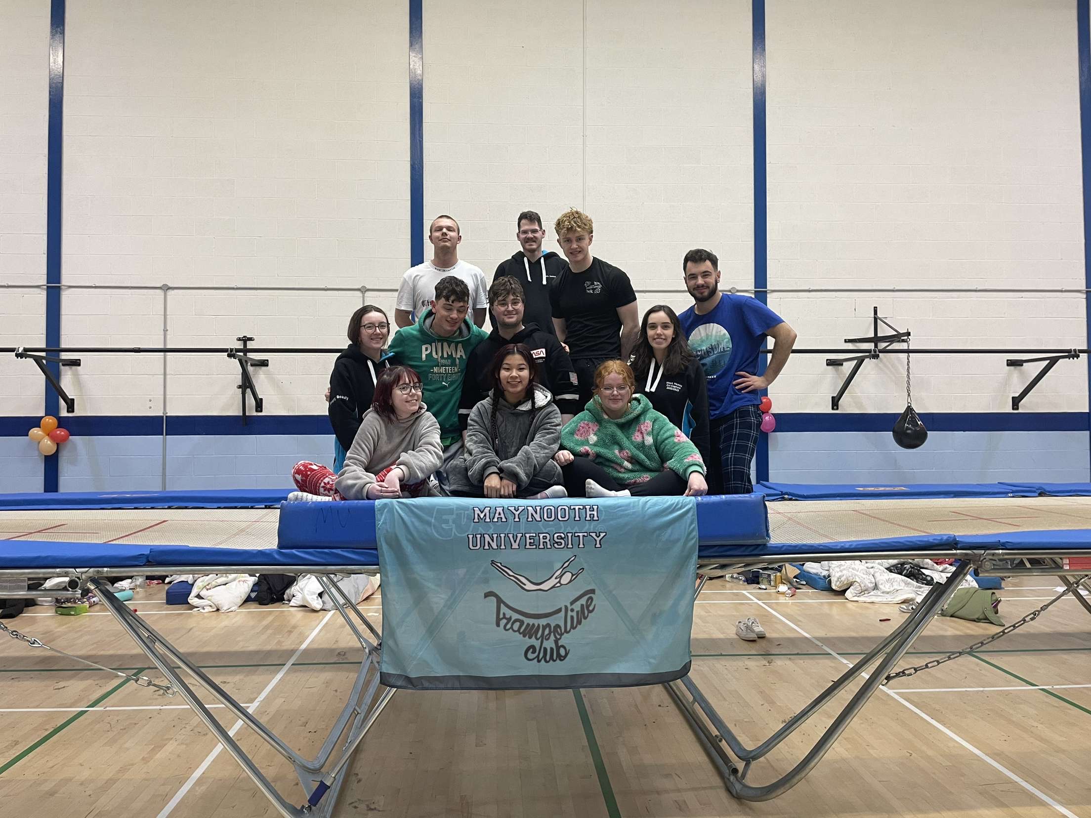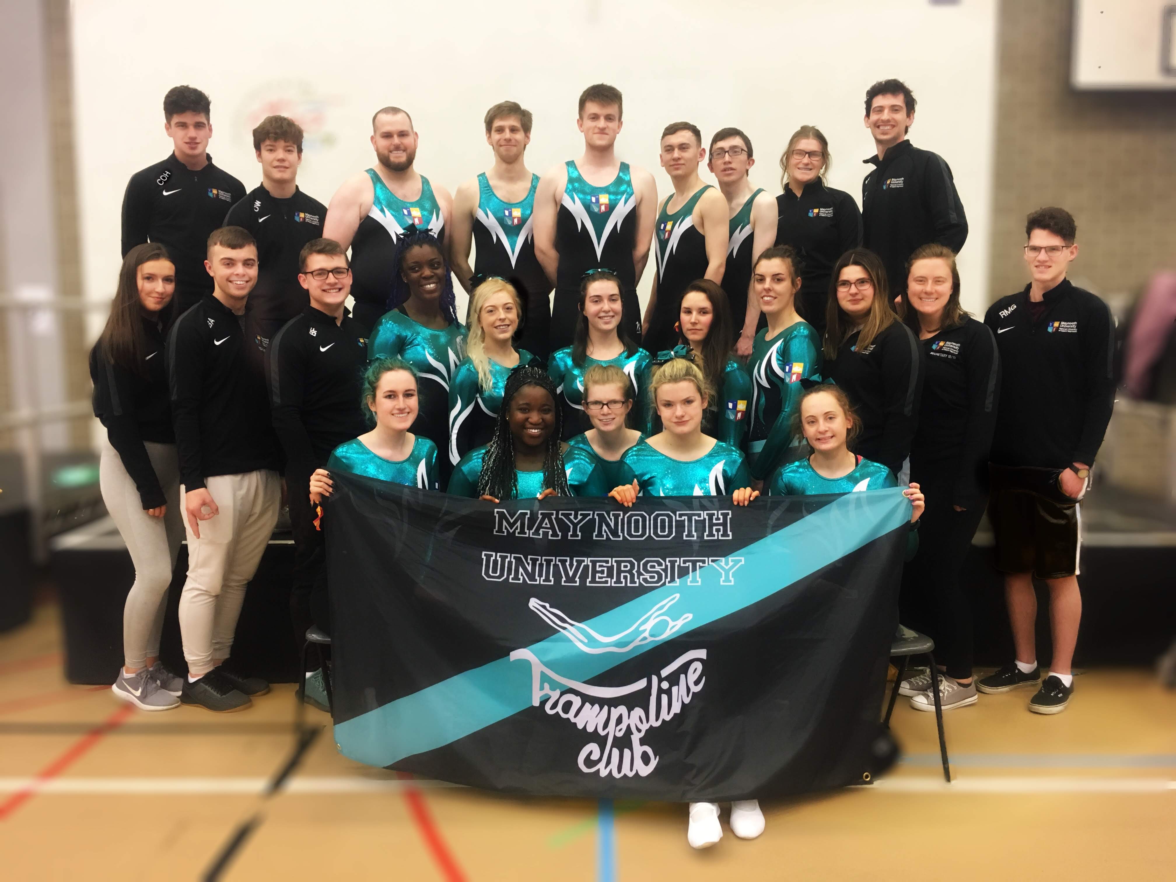 We are Maynooth University Trampoline Club! Welcome to MUTC, Maynooth's only stop for Gymnastic Trampolining! Fancy traveling across the country and abroad to compete for your University? Want to give a unique sport a try for the very first time? Or do you just want to come down and have the craic, party hard, and make some of the best memories you'll ever have in college? Maynooth Tramp's is the place for you! With Competitions from Dublin to Edinburgh, we travel far and wide to compete, weekly events and Crazy Nights Out to make your time with us the best possible, and with our seasoned coaches and daily training sessions to attend, you can be sure that this will be a once in a lifetime opportunity! No experience is necessary to join, we cater all our Training Sessions to suit YOUR needs; from total Novices all the way to seasoned Elite-Pros!