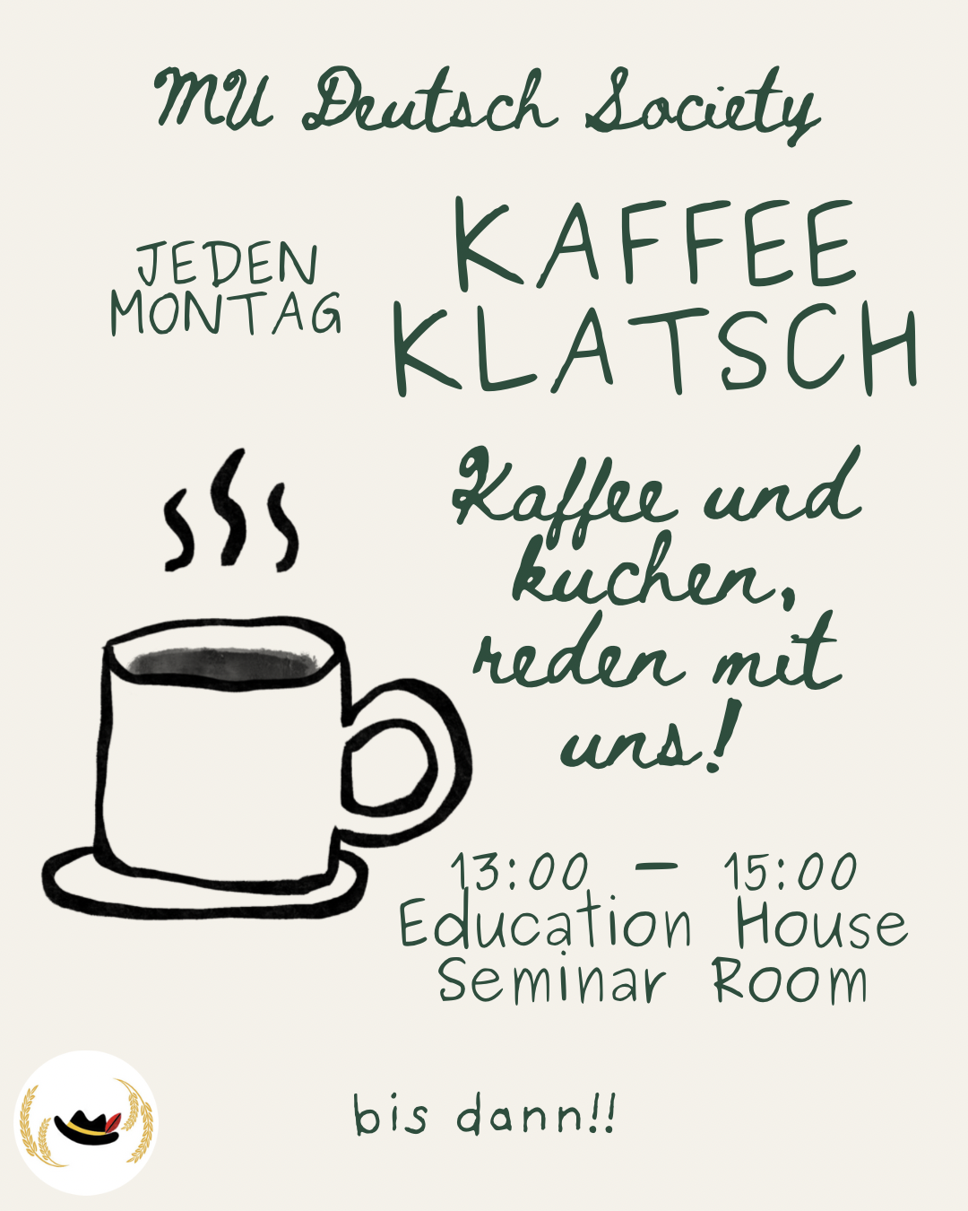 Kaffeklatsch is our weekly German society coffee and chats session. In Kaffeeklatsch we aim to promote the use of the German language in a fun and welcoming environment. We provide tea, coffee, cakes and treats for our members and discuss various topics and tell stories through German.