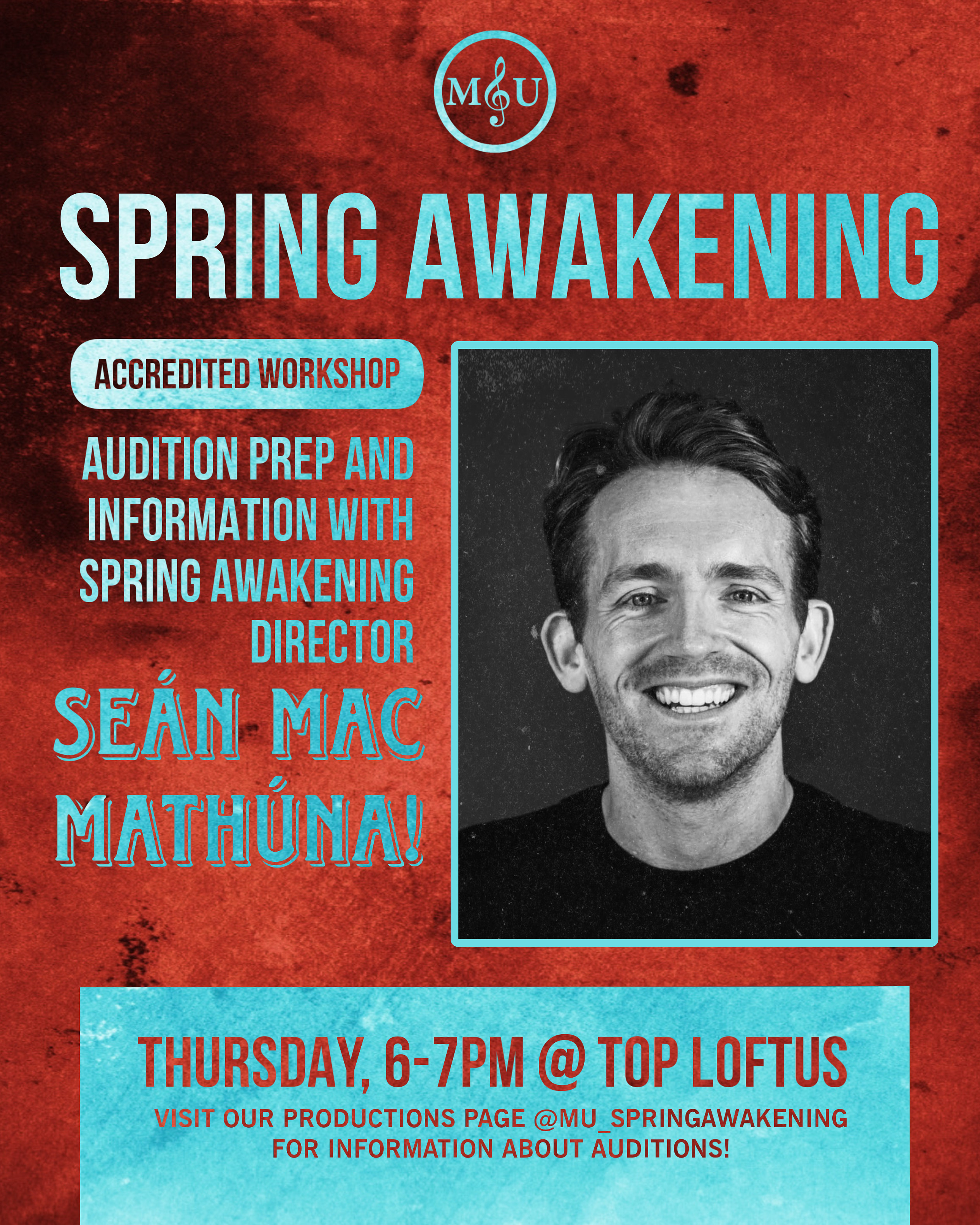 Location: Top LoftusWe are so excited to have our fabulous director for our upcoming full scale production Sean Mac Mathúna join us this Thursday to give us all the tips and tricks on how to prepare for your audition for Spring Awakening! Can't wait to see you all there! |