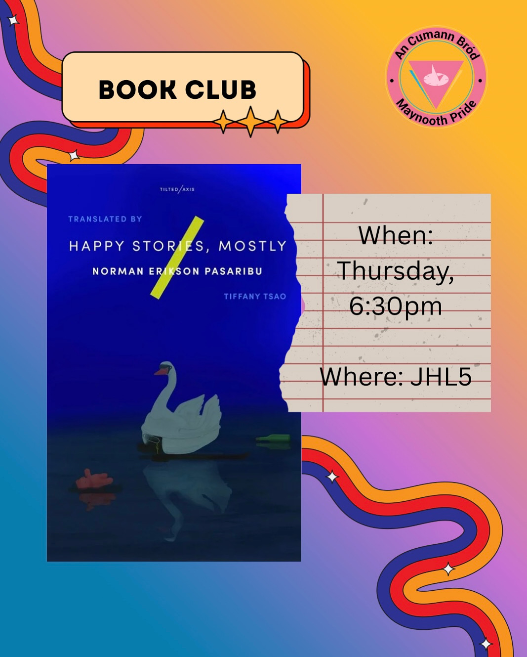 Excited to see you all at our weekly book club on Thursdays, starting from 6:30 pm. The book that we picked this time is a collection of short stories called "Happy Stories, Mostly" by Norman Erikson Pasaribu*