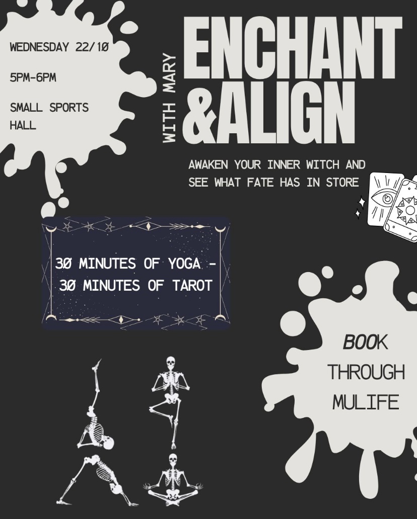 Join Mary for a Halloween yoga session in the Small Sports Hall, to awaken your inner witch. Flow through spellbinding poses, then get your tarot card read to see what fate has in store.