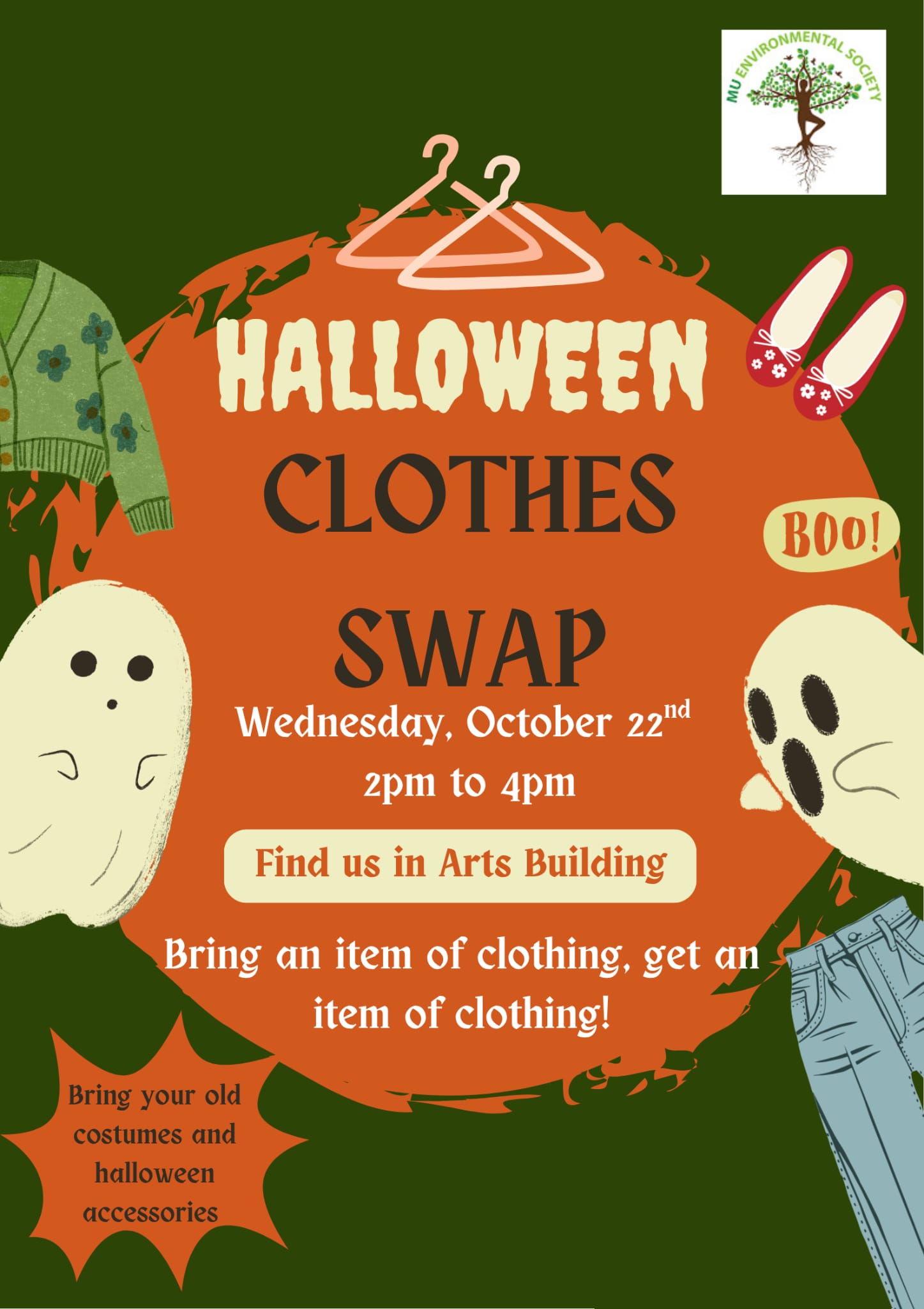 The Environmental Society's swap shops are BACK with a Halloween-themed clothes swap! Bring us in up to 5 items of clothing and you may swap them with our second-hand stash. This includes your pre-loved Halloween costumes- masks, pointy hats, and vampire cloaks welcome! Why buy a new costume when you can get one with us for FREE, practicing sustainable consumption and making your life easier. Fáilte roimh chách- members and non-members, students and staff, all welcome. Catch us in Arts Block from 2 -- 4 pm to see what you can find!