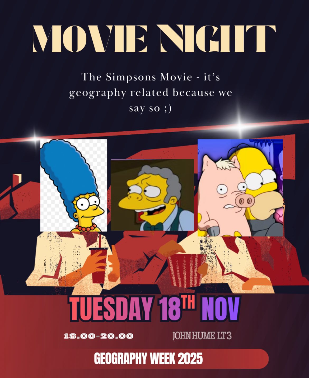 Hey everyone, As part of Geography week, the Geography society are hosting a movie tonight this Tuesday (18/11/25), and are showing The Simpsons Movie. The Geography society has kindly invited us (Enviro soc) to join them at their event. If anyone is interested, we will be in John Hume, Lecture Theatre 3 from 6pm to 8pm for the movie! Thank you! Maya (PRO)