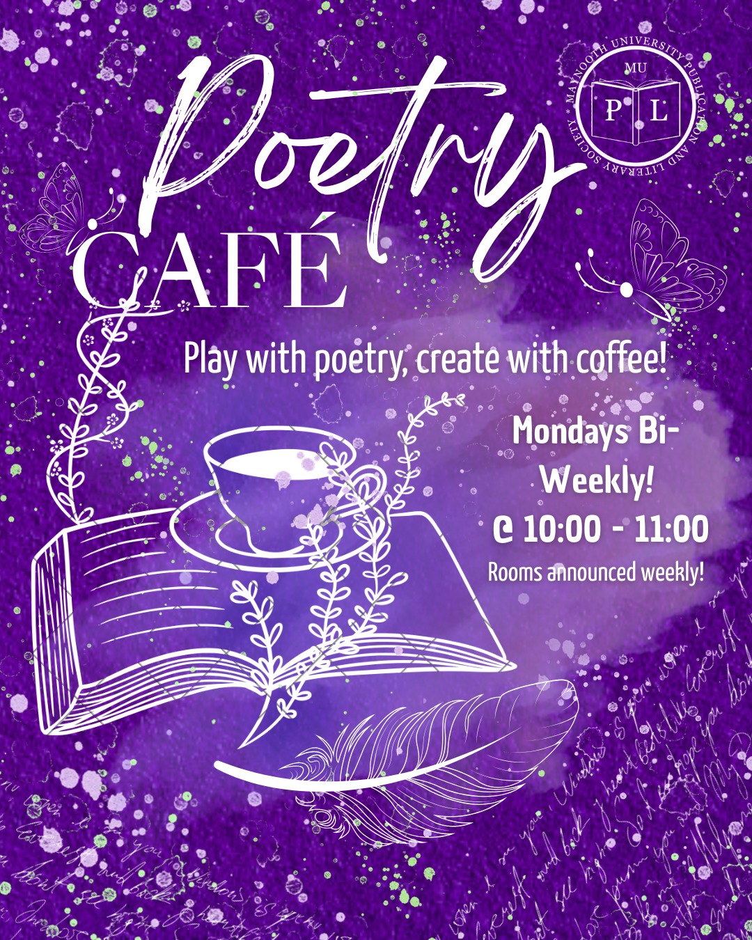 Fortnightly Poetry Café. An opportunity to discuss and write poetry alongside your peers with tea, coffee and biscuits! Check the Instagram and weekly email for more info. Please note that we will host this event one week, the Fortnightly Book Club the next, and so on.