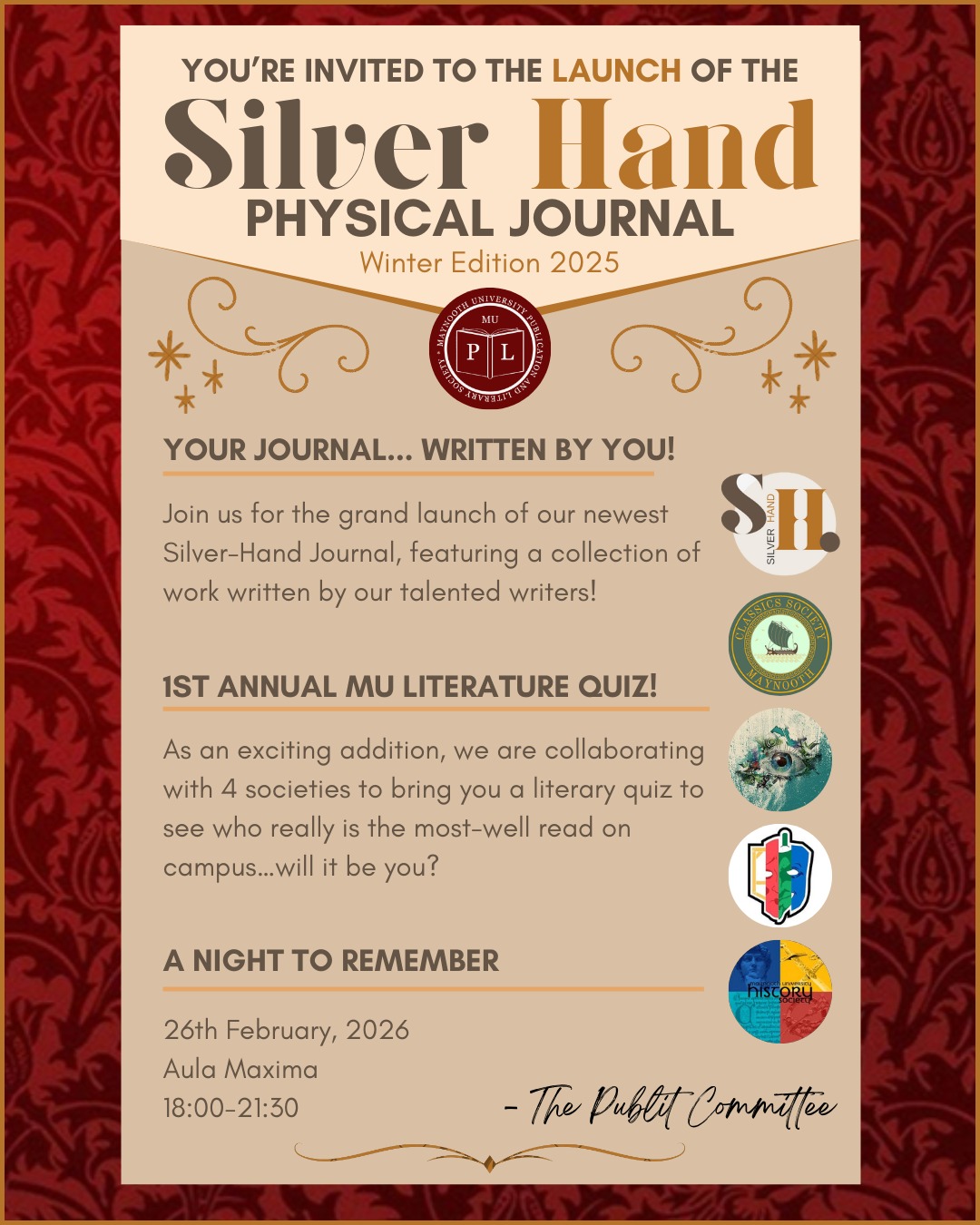 The event will comprise the sale of copies of a print anthology, compiling material we have published online at silverhandjournal.com. Copies will cost three euro each. It will be largely a social event, with a collaborative literary quiz co-hosted by Maynooth's Classics, Drama, History and Philosophy societies in the last hour and a half, with each society hosting a round. When the event concludes, we will close the doors and rearrange the venue as found. We will also be inviting a selection of Maynooth University students, alumni and staff via email.