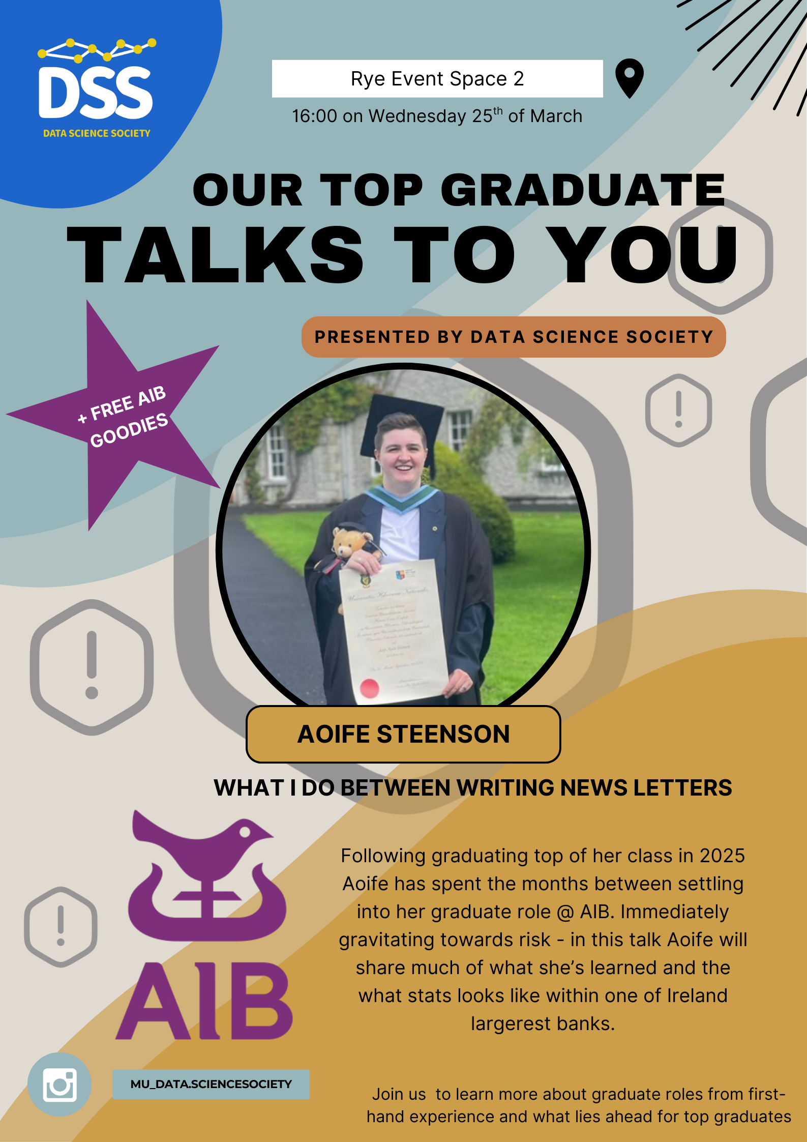 Aoife Steenson is a graduate risk analyst @ AIB. She was the highest achieving data science graduate last year and is returning to Maynooth to tell us more about her experience beyond.