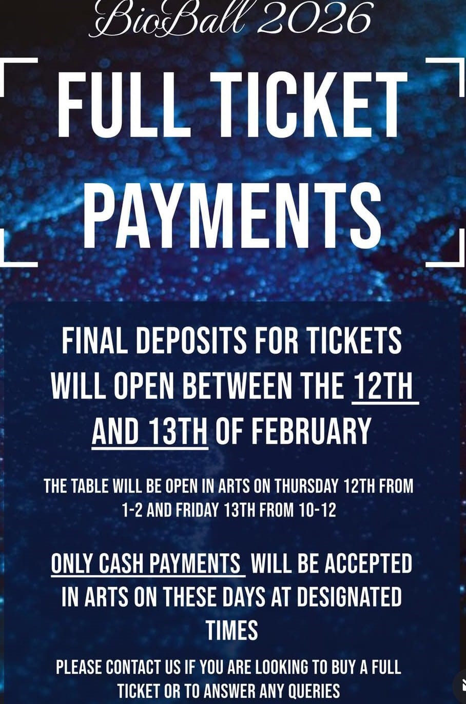 The second and final day of the Bio Ball Ticket Deposit Collection! Happening Friday the13th between 10AM and 12PM in the Arts Building Hallway, cash payments only will be accepted in person, while card or online payments can be made at the Biology Society MULife page.
