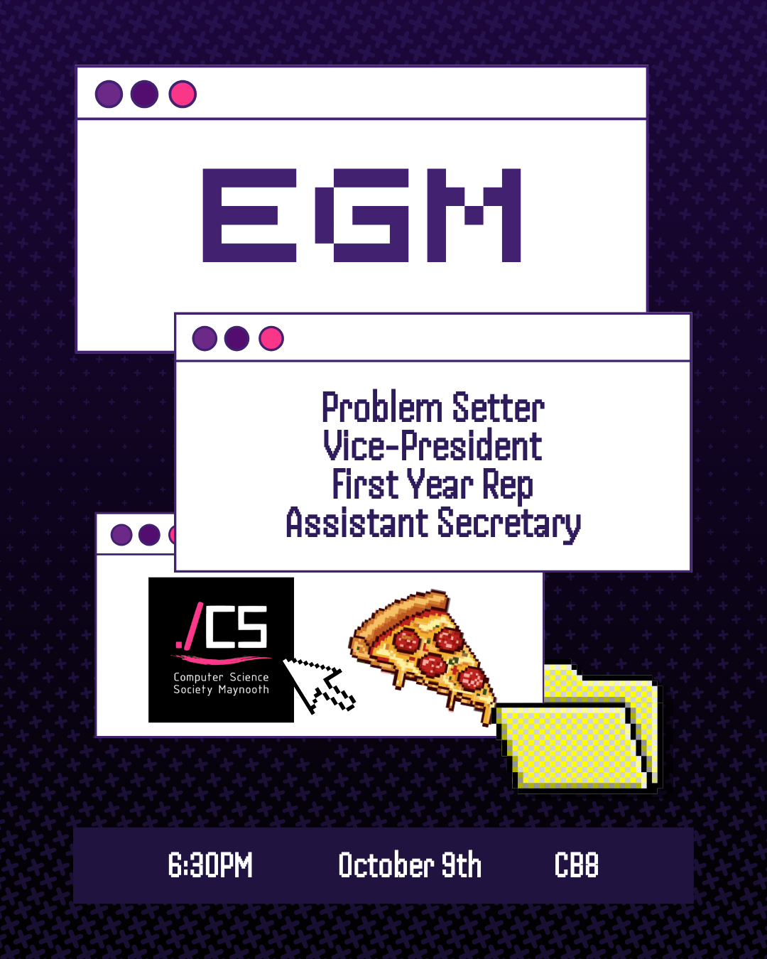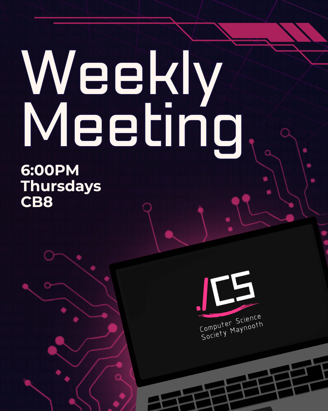 Join the Computer Science Society every Thursday @ 6pm for laid-back evenings of talks, workshops, and general social get-togethers! Bring your friends along, meet new people who share your interests! Every night promises to be great! We'll always give you the latest on what you can get up to as a CS student (or even just if you're interested in CS!) in Maynooth!