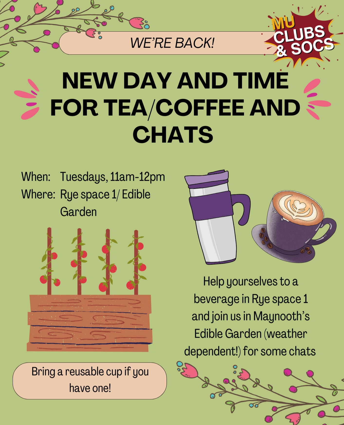 Enviro Soc invites members for a relaxed meetup with tea, coffee and chats every Wednesday between 1 and 2. We will organise teas and coffees in Rye Space 2, then (weather-dependent) head off to the Edible Garden for the fresh air and chats. Bígí linn! This is during Edible Garden Sessions, so those with an interest can take the opportunity to ask some questions and maybe even get some gardening in! Make sure to bring a reusable coffee cup or mug if you have one- this is the Environmental Society after all...