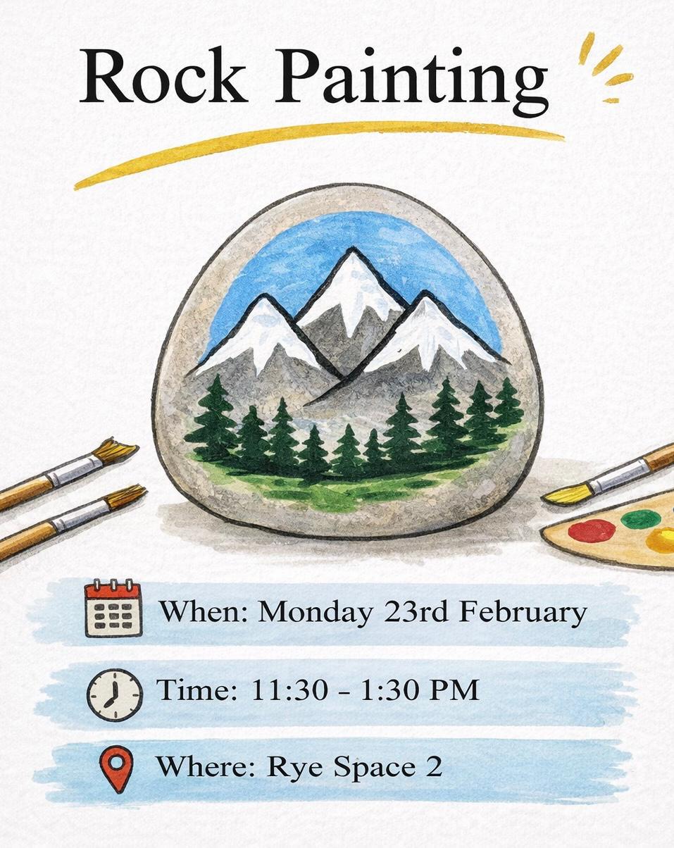 Rock painting is back for semester 2 after an exciting launch in sem 1, taking place in the Clubs and Socs Rye Space 2, we have the paint, the brushes and the rocks but if you want to bring your own you can all we need is you