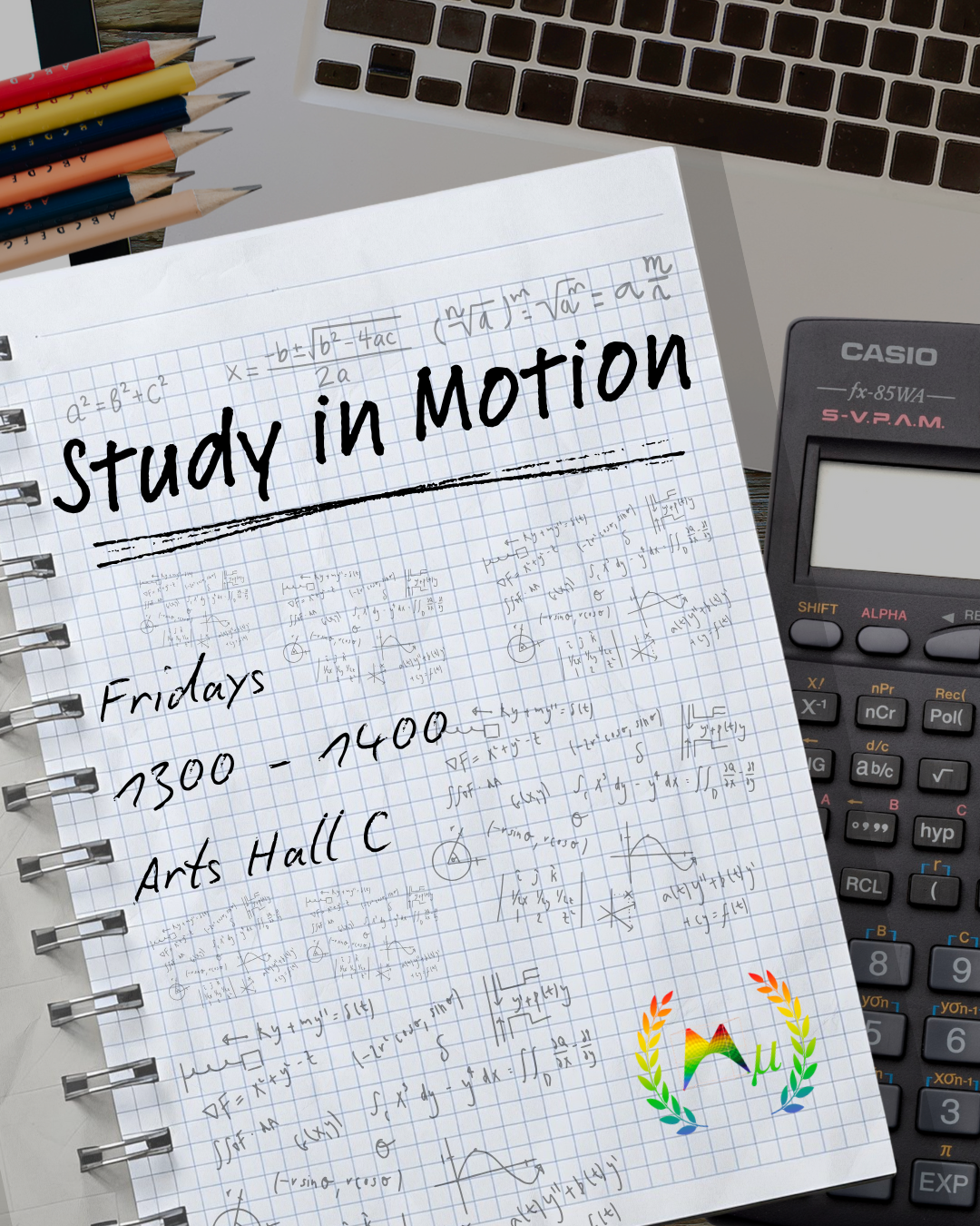 For anyone looking for help with their coursework we recommend going to the Maths Support Centre or tutorials and other department organised supports. The society does have a regular study group session (on Fridays 1-2pm in Arts Hall C) and you are more than welcome to come along to work on coursework either by yourself or in a group.