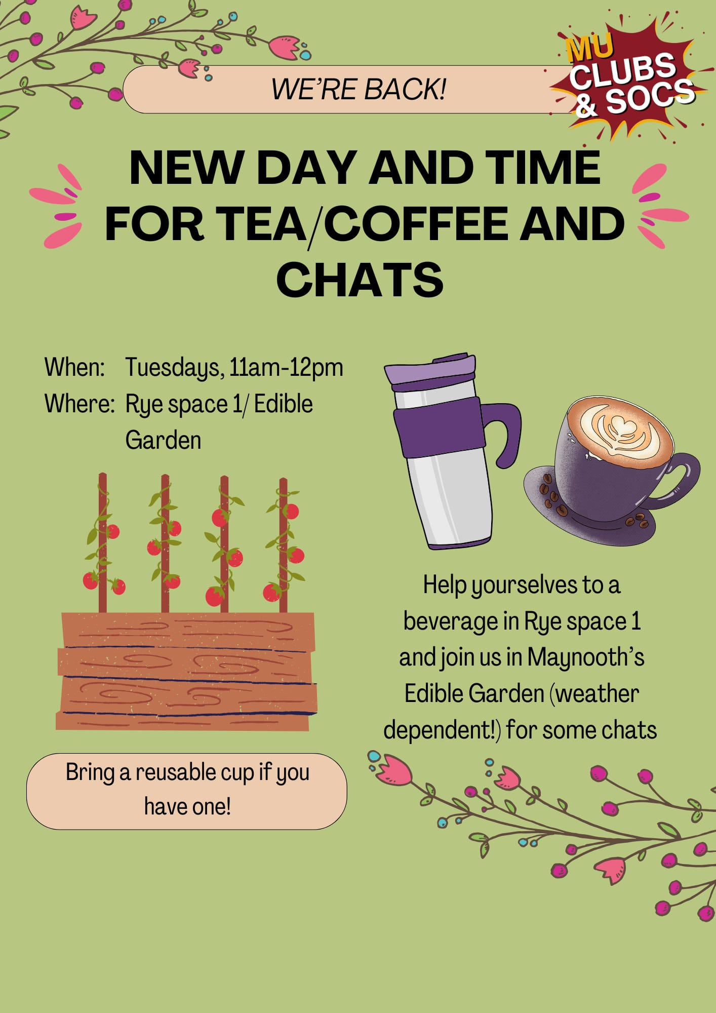 Our weekly tea and coffee sessions are back! In collaboration with the Environmental Society and Geography Society, join us every Tuesday from 11am to 12pm at Rye Hall 1 to enjoy a cup of something warm, and visit the Edible Garden (weather permitting!). An opportunity to relax and connect with fellow students.