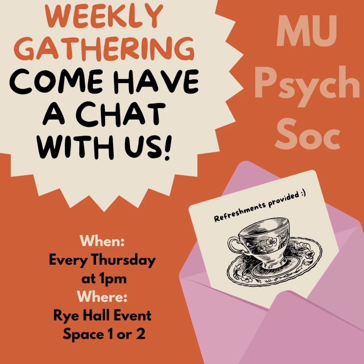 Join us every week to meet up and have a chat! On Thursdays at 1pm, we'll have tea, coffee and snacks and you'll be able to socialise with fellow Psych Soc members. Our first meeting (on 16/10) will be in Rye Hall Event Space 2 but we'll be in Rye Event Space 1 from 23/10 onwards. We'll notify you if there's any changes to this schedule!