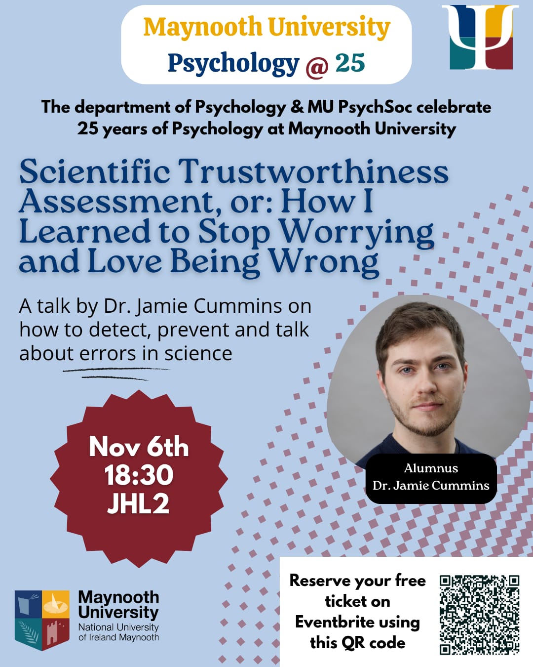 Join us for a talk given by Maynooth Alumnus Dr. Jamie Cummins! To celebrate the 25th anniversary of the Maynooth University Psychology department, Dr. Cummins will be coming to speak about how to detect, prevent and talk about errors in science. In general, the talk will cover trustworthiness assessment and touch on developing AI tools to help us with this, while keeping in mind the ways AI can lead us astray. At the end, we'll have a Q&A session and then a reception afterwards with food and drink. Based on who attends the event, you may even get a discount on Psychology Society merch. Make sure to book a ticket on Eventbrite so we can gauge the numbers! Members and non-members of the Society are welcome.