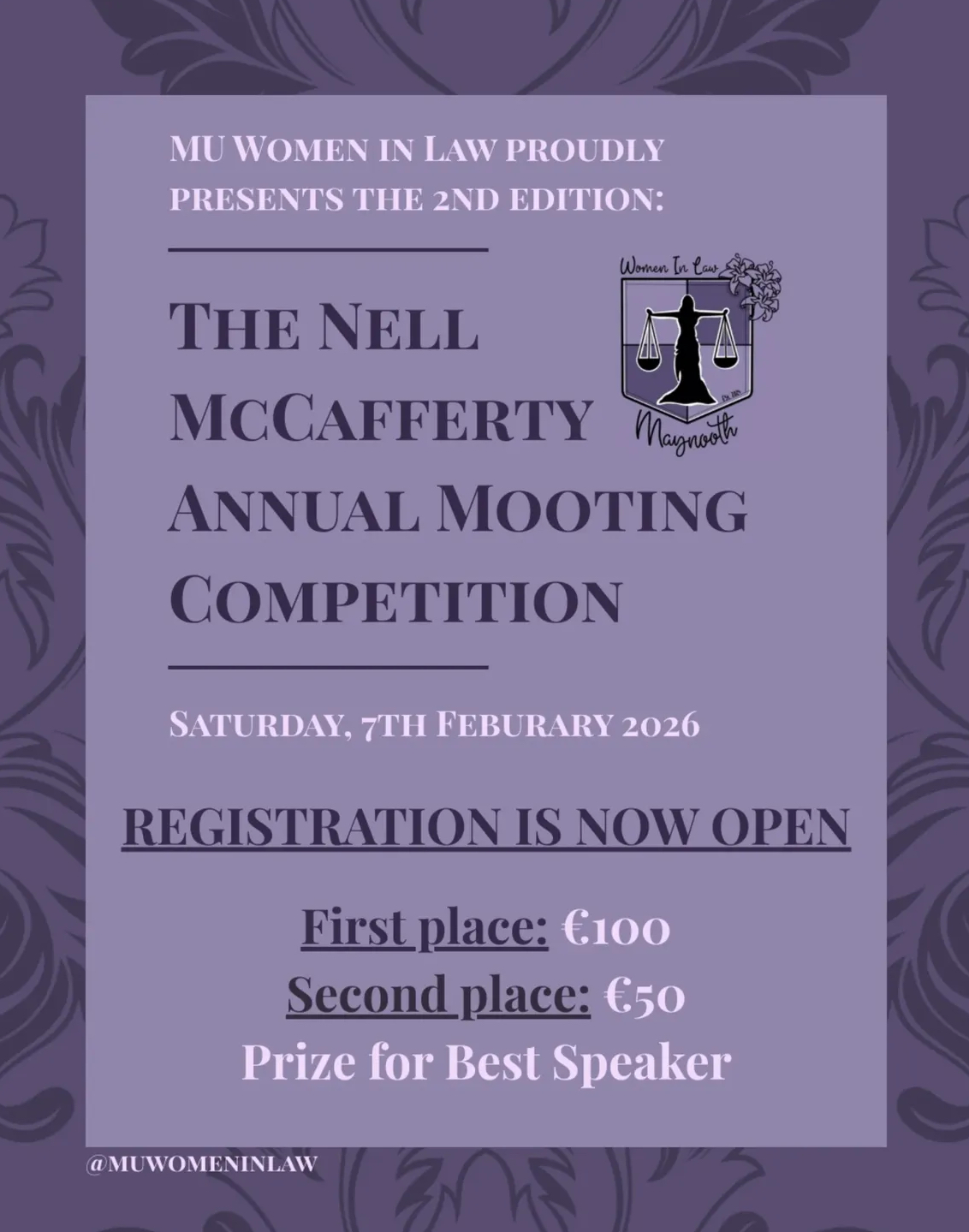 The Women in Law society are delighted to announce the second year of the Nell McCafferty Annual Mooting Competition, which will take place on Saturday, 7th February 2026.
