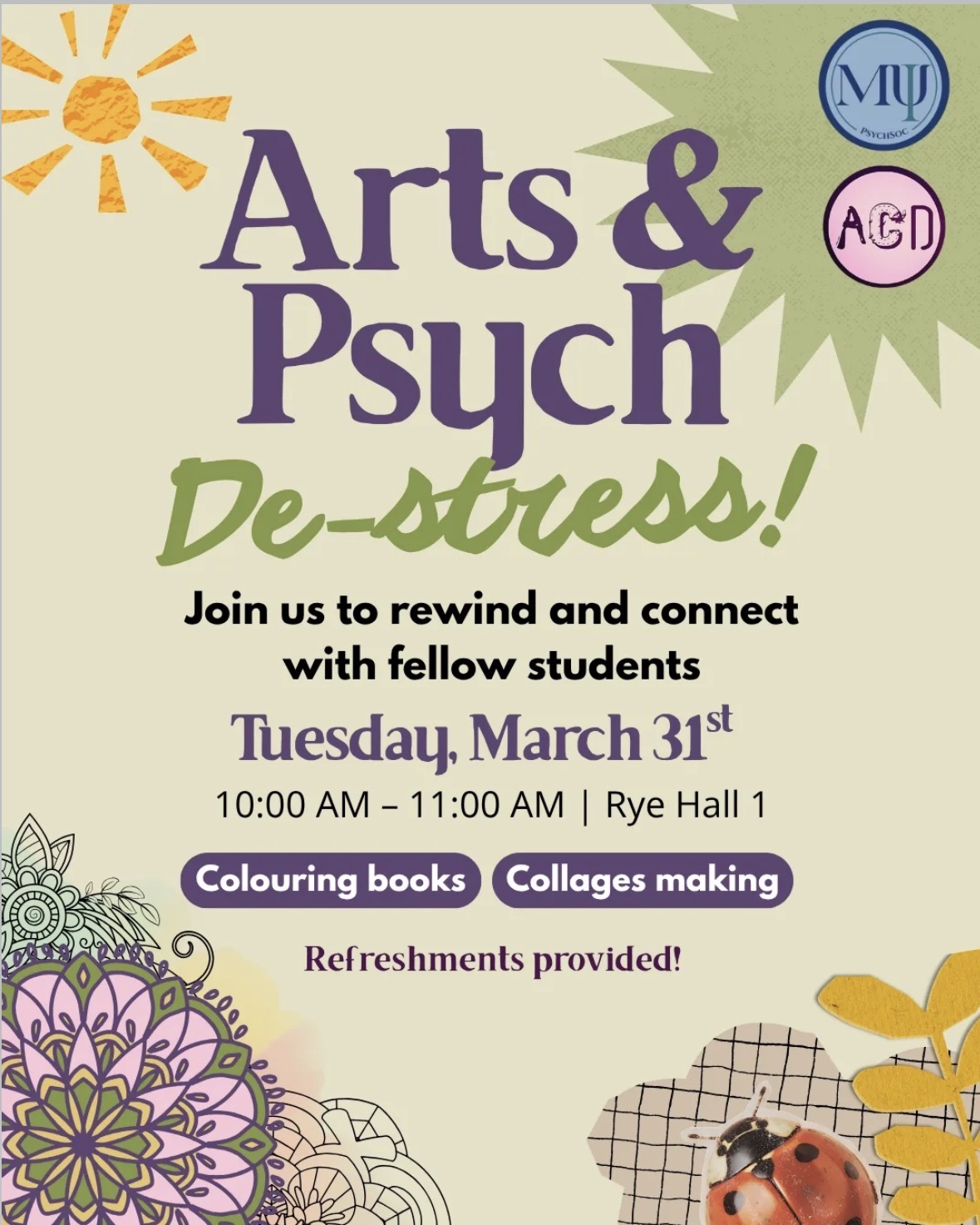 "Feeling a bit anxious? Need some time to rewind?Join us this Tuesday 31st of March from 10am to 11am in Rye Hall 1 to do arts and crafts and enjoy some refreshments.We will provide colouring books and collage materials for everyone, so don't hesitate to join us and use this time to relax and connect with fellow students before Easter break.We hope to see you there!"