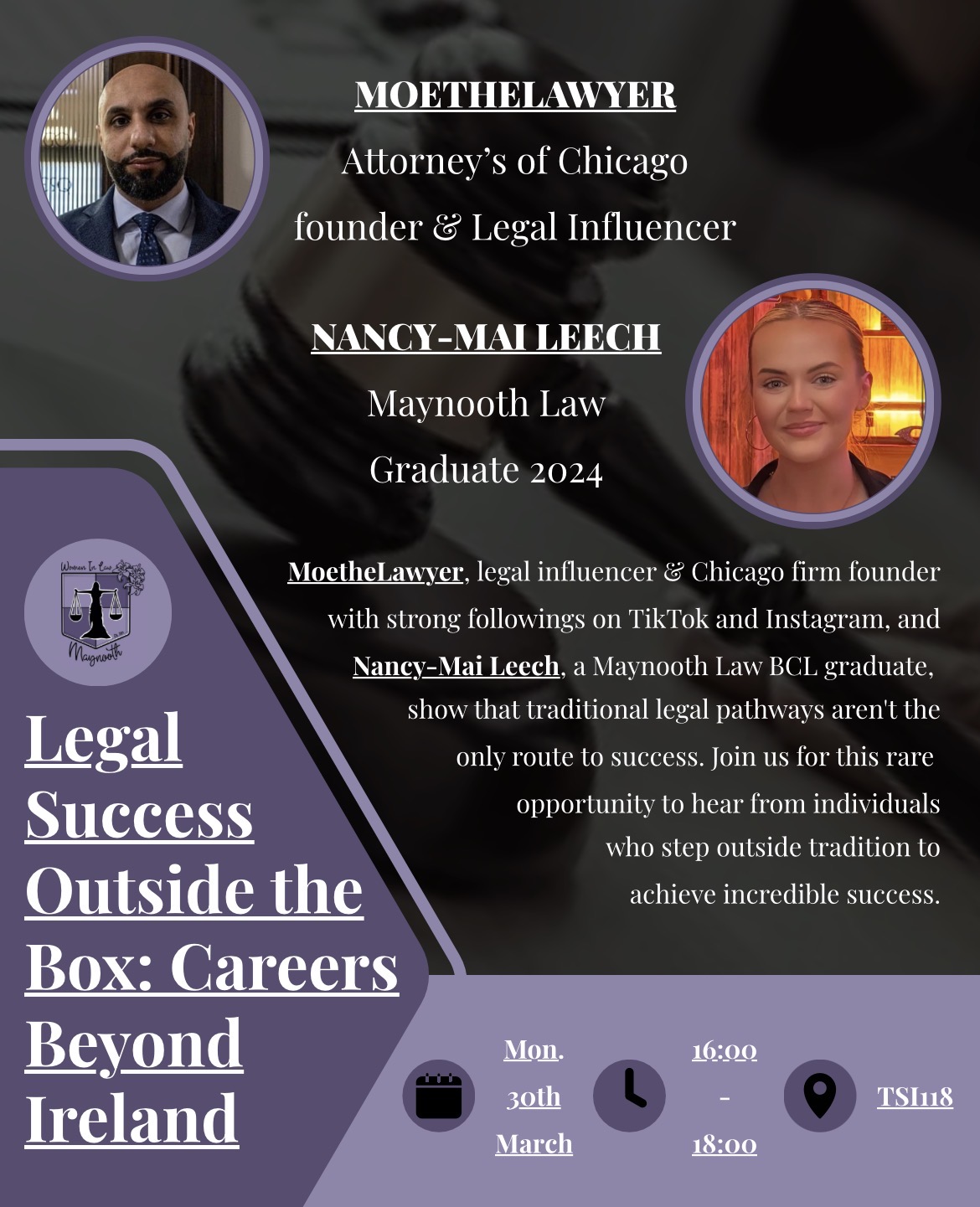 "To kickstart the semester again we have a special event planned for this coming Monday. We will be joined by Moe the Lawyer, a legal influencer and Chicago firm founder with strong followings on TikTok and Instagram, along with Nancy-Mai Leech, a Maynooth Law BCL graduate, demonstrating that traditional pathways aren't the only route to success. Join us for this rare opportunity to hear from individuals who stepped outside tradition to achieve incredible success, we hope to see you all there !Date: Monday, 30th March. Time: 4pm-6pm. Location: TSI118. "