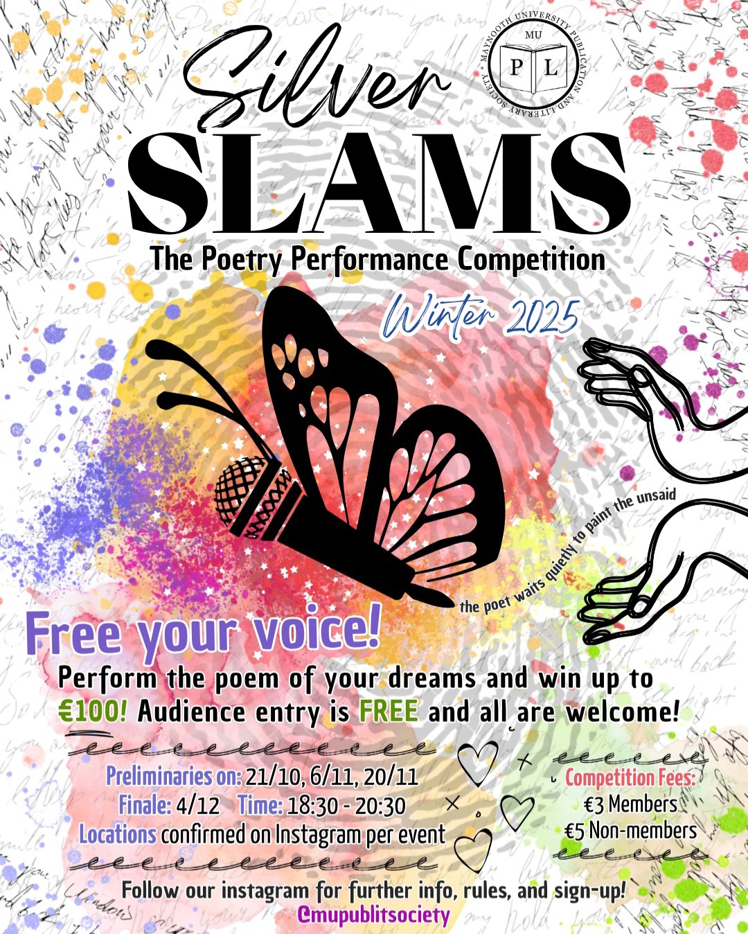 Our poetry contest and reading event, Silver Slams, will be triumphantly returning this week!On October 21st, at 6:30pm in the Rye Events Space, the popular event will be returning from last semester to prop up a new series of poetic voices from across campus.This will be the first preliminary session of three, before a finale where contestants can have the chance to win up to €100 in prizes. Society members can submit and perform their poetry for €3, and non-members in the university can d ... Read More »